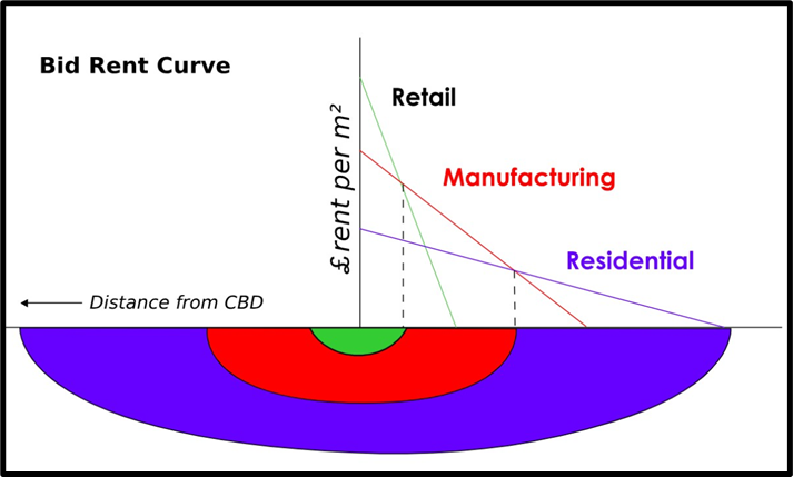 - Retail (maximum revenue from centrality) → highest bidder → occupies CBD.