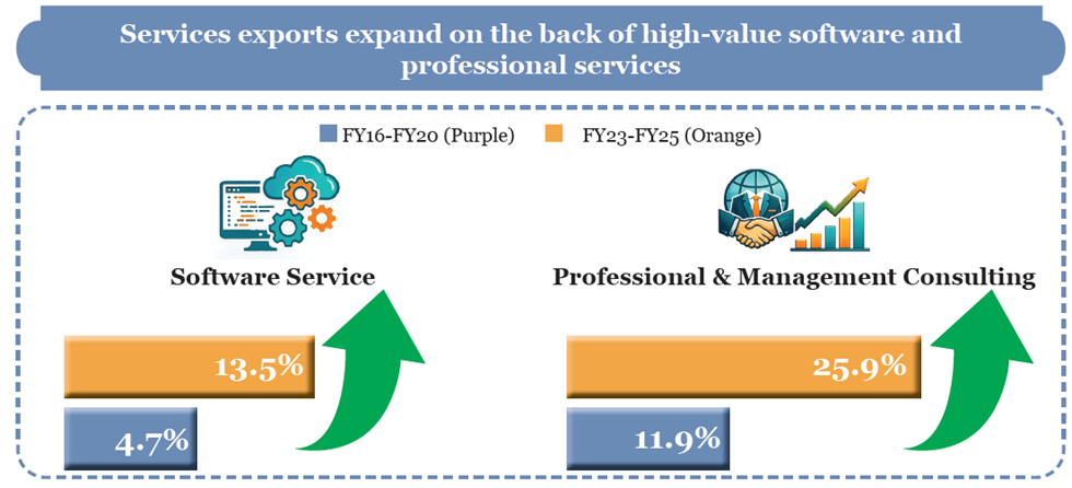 - The composition of services has shifted towards high-value, technology-driven segments.