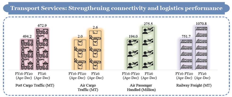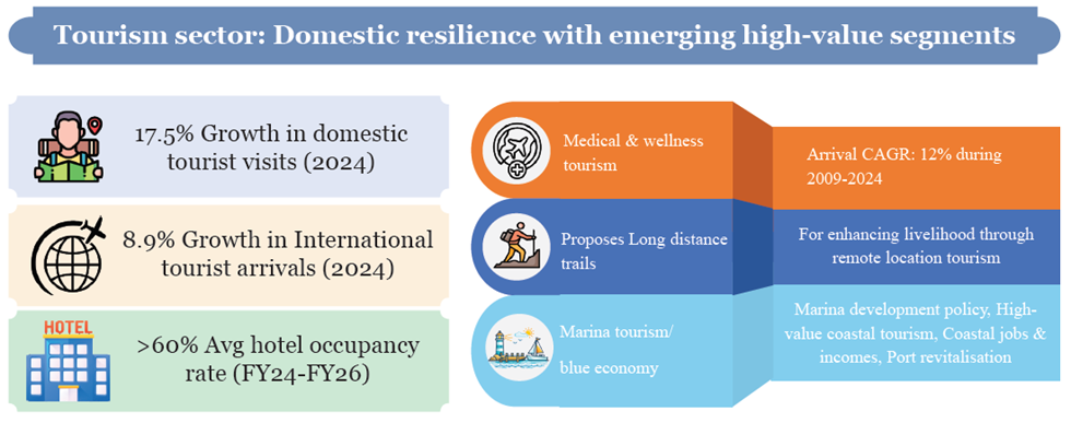 The tourism sector is increasingly supported by domestic demand and niche segments like medical tourism, while IT-ITeS continues to evolve towards high-value, innovation-driven activities led by Global Capability Centres (GCCs) and AI adoption. Transport and telecom act as foundational enablers, improving connectivity and logistics efficiency across the economy.