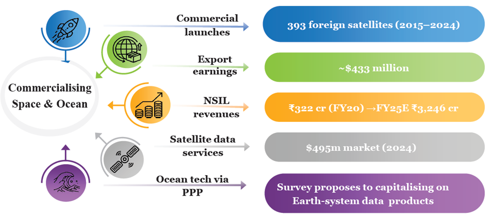 - India’s space sector is becoming a high-value, export-oriented services segment.