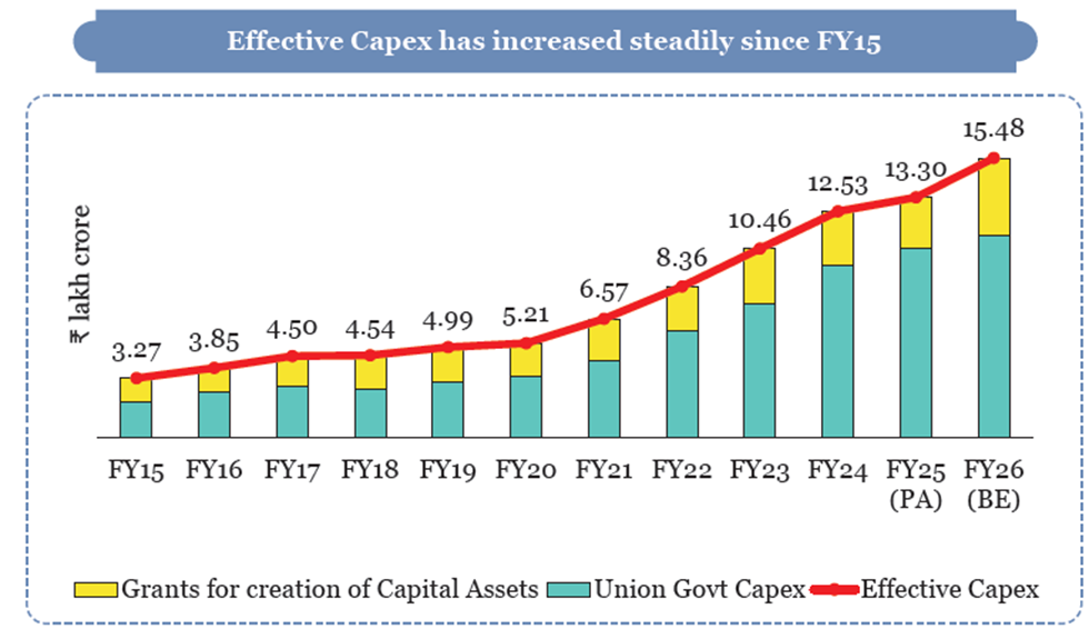 - Government capex rose from ₹3.07 lakh crore (FY19) to ₹11.21 lakh crore (FY26 BE).