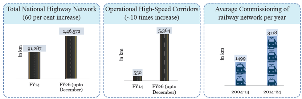 This expansion is not limited to traditional infrastructure like roads, railways, and energy but also includes digital public infrastructure and renewable energy systems, reflecting a shift towards integrated and future-ready development. Institutional innovations such as PM GatiShakti and the National Logistics Policy have improved coordination, efficiency, and logistics competitiveness.