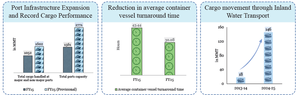 - Inland Water Transport cargo increased from 18 MMT (2014) to 146 MMT (2025).
