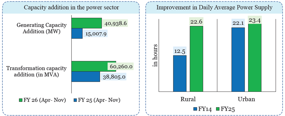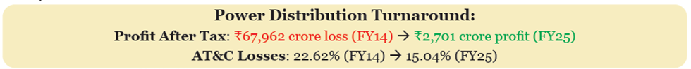 - Distribution sector reforms improved DISCOM finances and reduced losses.