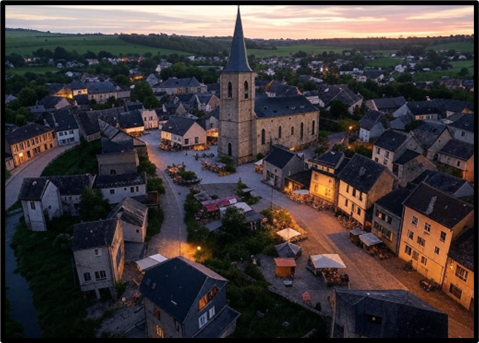 Medieval European towns with cobbled streets, market squares, and fortifications