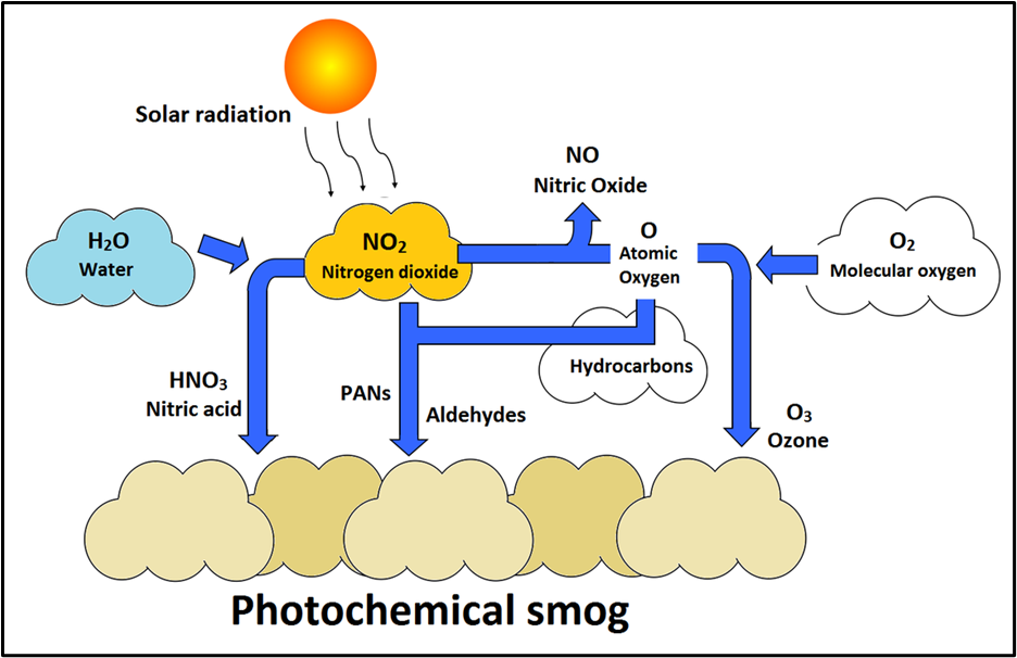 - Chemistry: NOx + VOCs + sunlight → O₃ (ozone) + PAN + other oxidants.