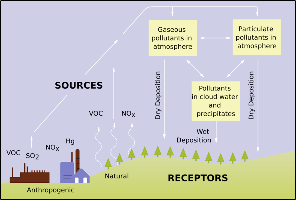- Wet deposition: acids carried down by precipitation; affects vegetation, soil, water bodies.