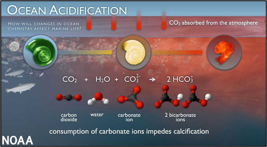 An increase in CO₂ causes an increase in H⁺ concentration → ocean pH decreases.