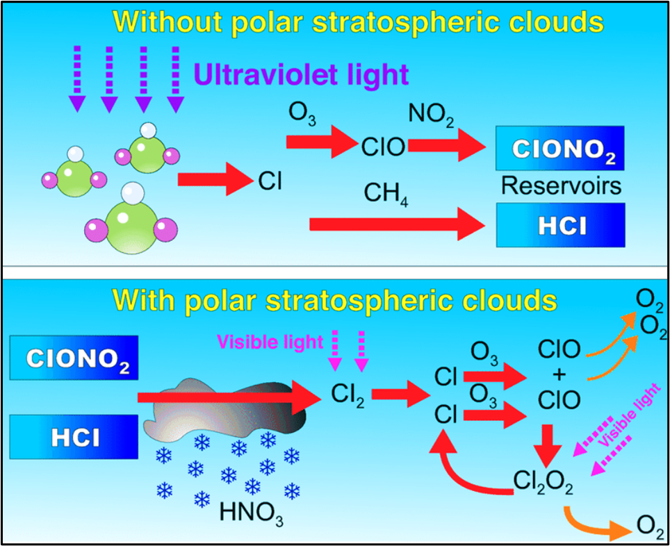 These radicals then rapidly destroy ozone once sunlight returns in spring.