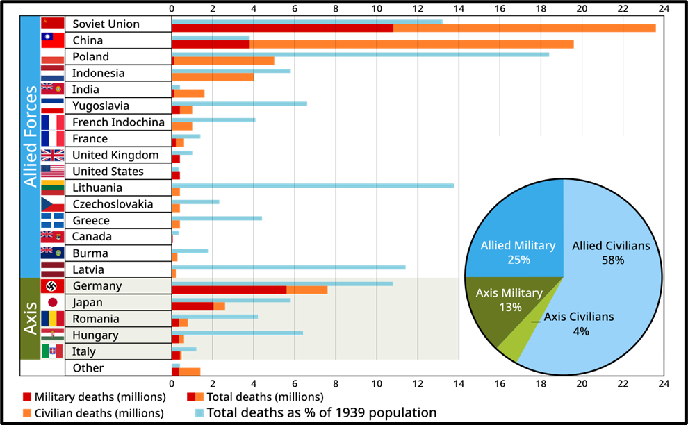 The war resulted in unprecedented destruction across Europe and Asia. Nearly 40 million people lost their lives, with the Soviet Union suffering the highest casualties. Countries like Poland, Germany, China, and Japan also faced catastrophic losses.