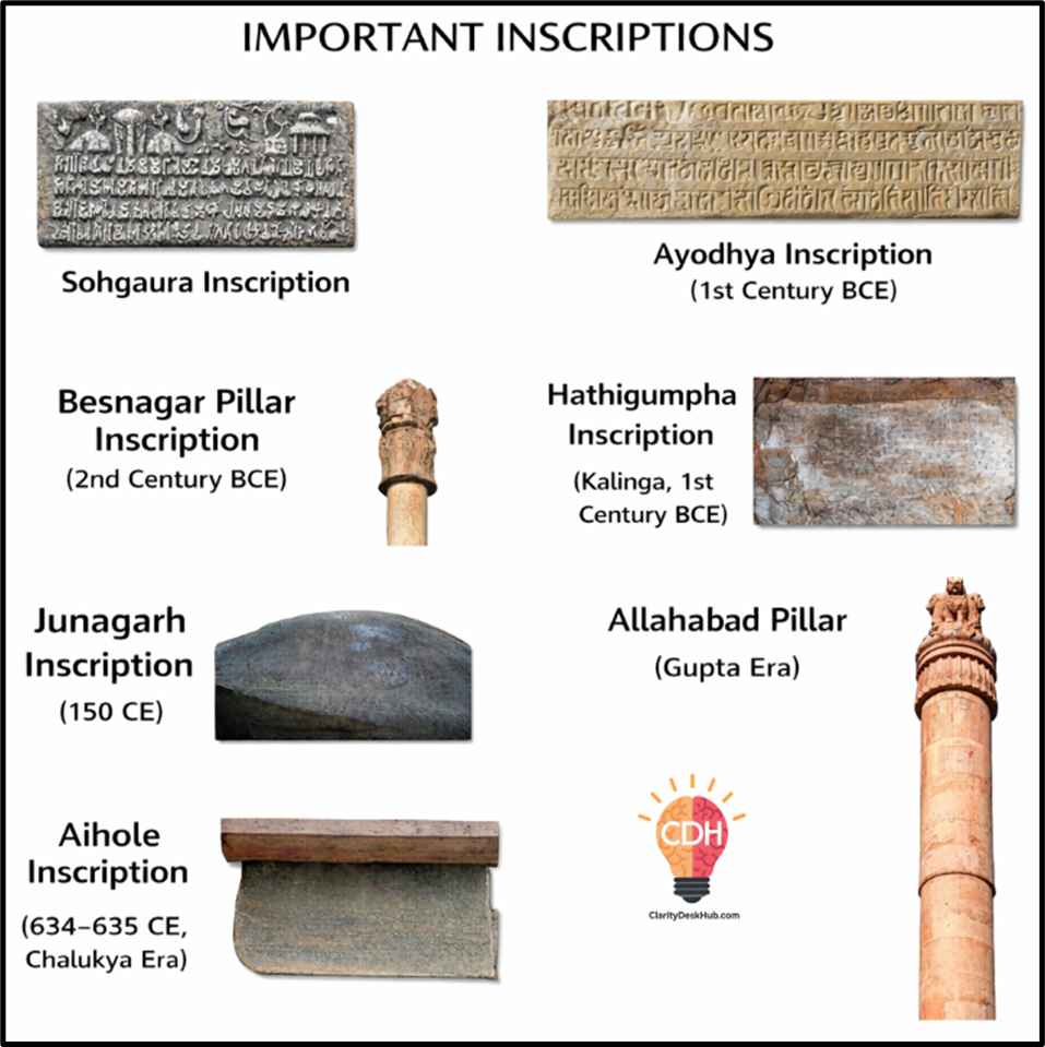 - Inscriptions are permanent writings engraved on durable materials such as → Stone, Metal (especially copper plates), Terracotta, Pillars, Temple walls, Sculptures