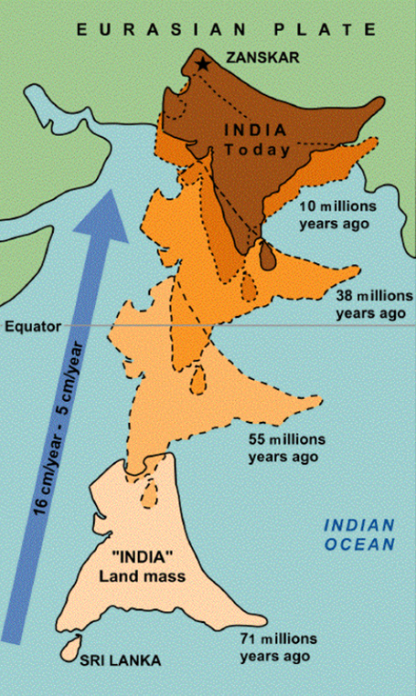 200–140 mya | Indian Plate breaks from Gondwanaland, drifts north |