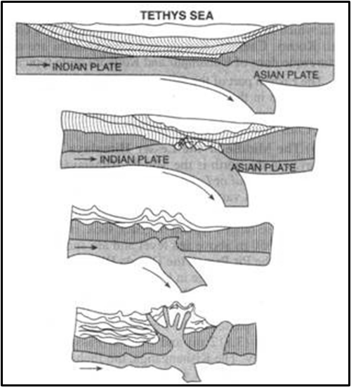 - The northwestern part of the Indian Plate collided first, creating a hinge-like rotation in an anticlockwise direction.