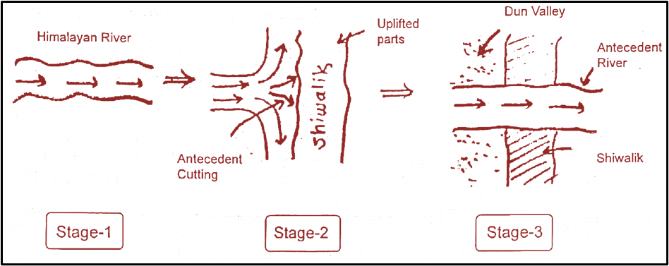 A Dun Valley is a longitudinal valley (i.e., running parallel to the mountain range) located between the Lesser Himalayas (Middle Himalayas) and the Shiwalik Hills (Outer Himalayas). These valleys were formed due to the interaction between rivers and tectonic movements.