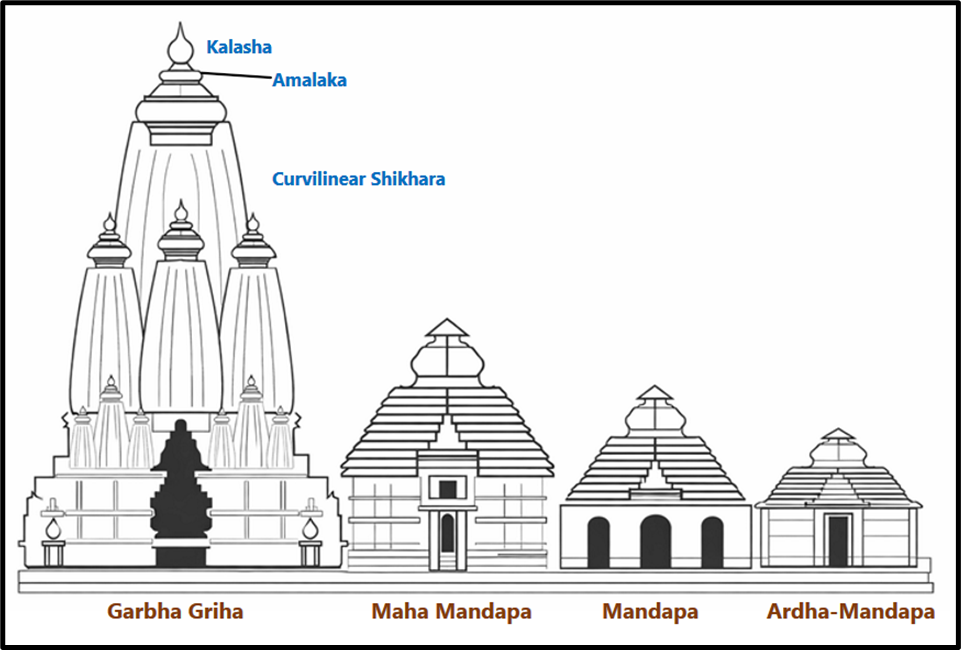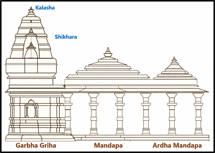 - Ardhamandapa (entrance porch); Mandapa (hall); Maha-mandapa (great hall); Garbhagriha