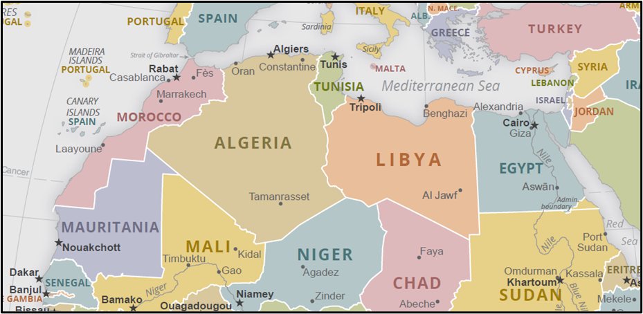 North Africa = Africa’s Mediterranean bridge to Europe.