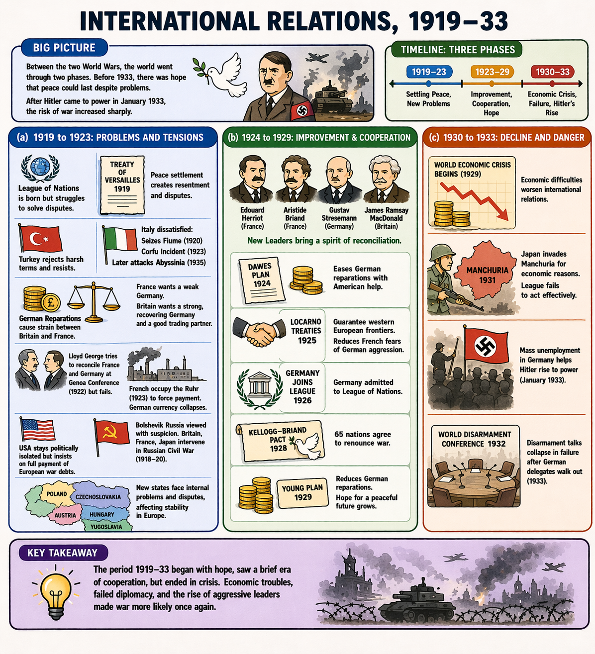Thus, the years between 1919 and 1933 can be understood as a phase of experimental diplomacy, where multiple initiatives were undertaken to stabilize international relations. However, these efforts often suffered from structural weaknesses, lack of enforcement, and overdependence on economic prosperity.