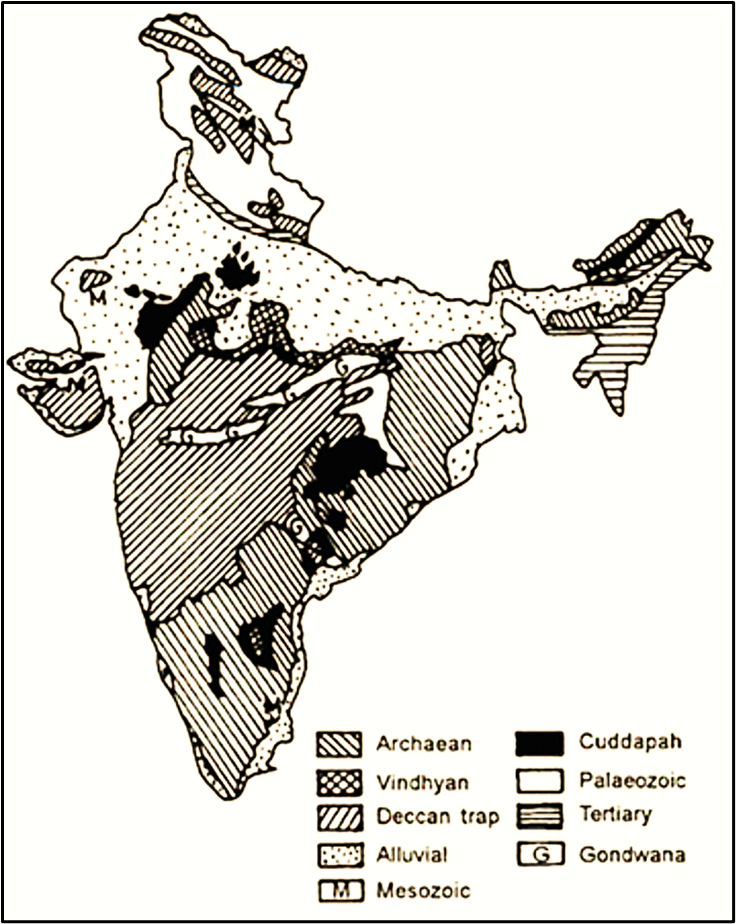 - Mainly sedimentary rocks (Vindhyan & Cuddapah).