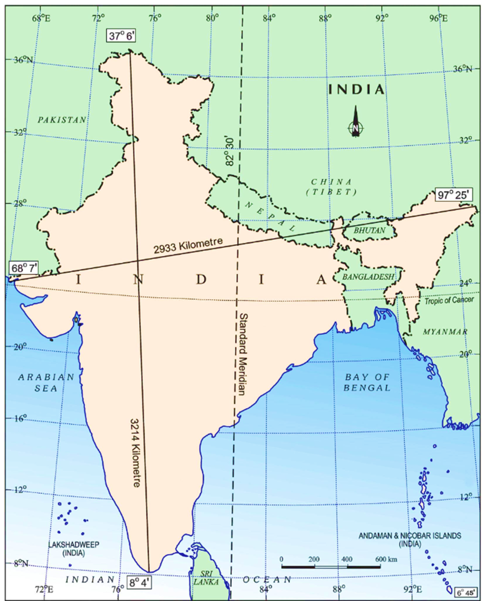 - North–South extent → from Ladakh in the north to Kanyakumari in the south.