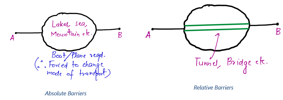 - Require a change in mode — e.g., road ends at sea → switch to ferry/air.