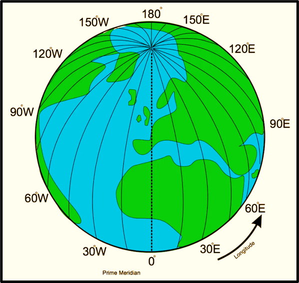 - London (Greenwich) is at 0° longitude.