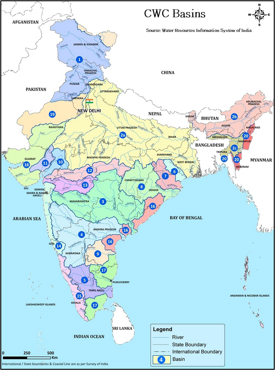 India has been divided into 22 major river basins by the Central Water Commission (CWC). These basins are categorized based on their drainage patterns and geographical regions.