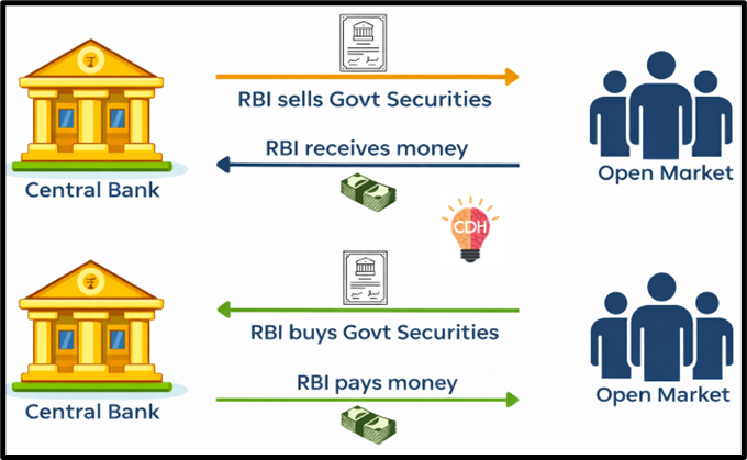 Open Market Operations (OMOs) refer to the buying and selling of government securities by RBI in the open market to regulate liquidity.