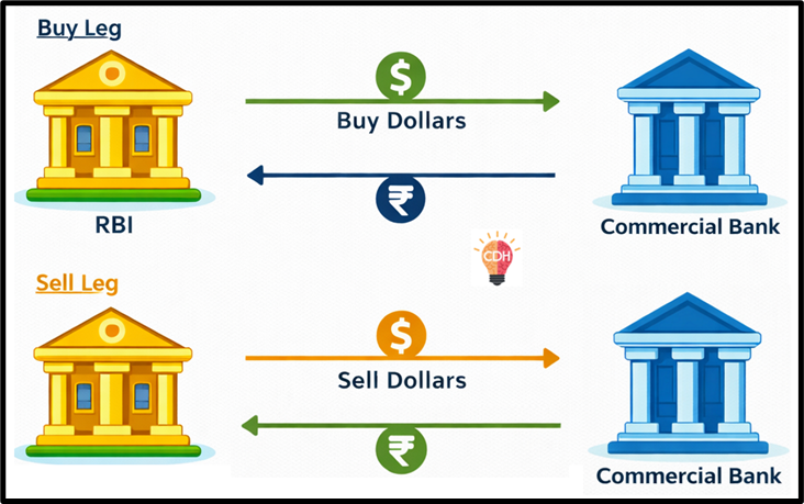 - Sell leg (now): RBI sells foreign currency (e.g., USD) to banks