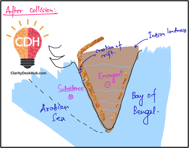- The collision of the Indian Plate with the Eurasian Plate (forming the Himalayas) caused subsidence in parts of the Peninsular block.