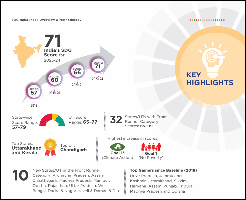 - The SDG India Index measures national progress using 113 indicators aligned to the National Indicator Framework.