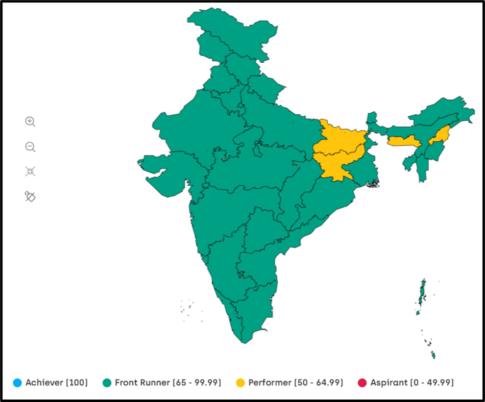 - Front-Runner States: 32 states and union territories (UTs) are in the front-runner category, with 10 new entrants including Arunachal Pradesh, Assam, Chhattisgarh, and Uttar Pradesh.