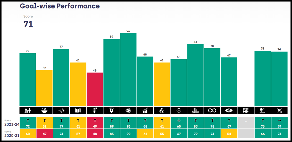 - Overall Progress: India’s overall SDG score improved to 71 in 2023-24 from 66 in 2020-21 and 57 in 2018. All states have shown improvement in overall scores. Progress has been largely driven by targeted government interventions in poverty reduction, economic growth, and climate action.