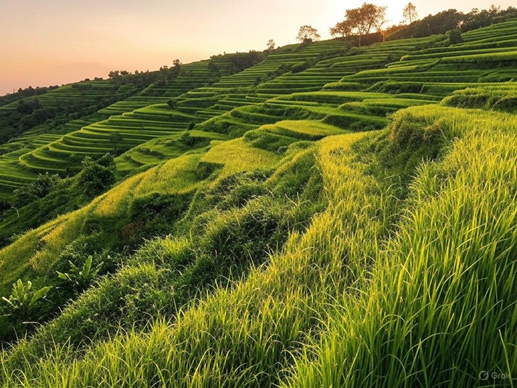 - Hills are carved into step-like terraces, slowing down water runoff and allowing crops to grow on sloped land.