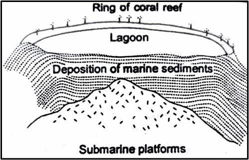 - A lagoon appears between the land and the reef due to the dissolution of dead corals.