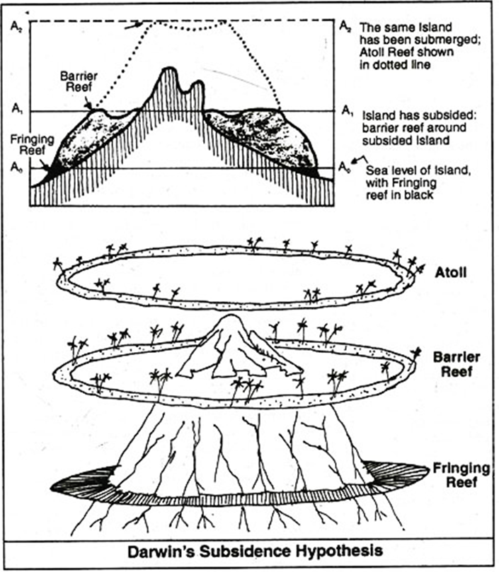 Darwin noticed that coral polyps could only thrive in shallow, sunlit waters. But the presence of deep-sea atolls (ring-shaped reefs enclosing a lagoon) puzzled him—how could corals survive and form reefs in such deep waters? His answer: subsidence of land.