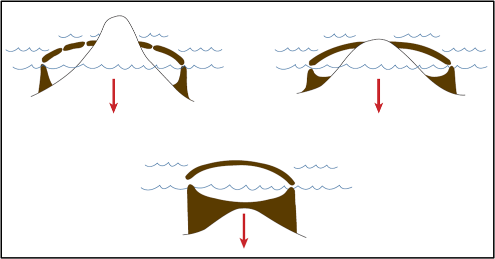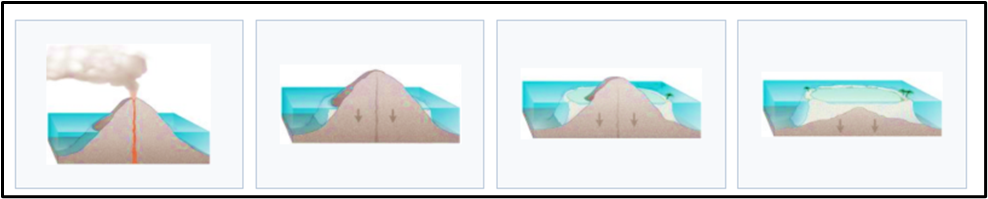 - Eventually, the island completely submerges, leaving behind only a circular reef surrounding a lagoon—an atoll.