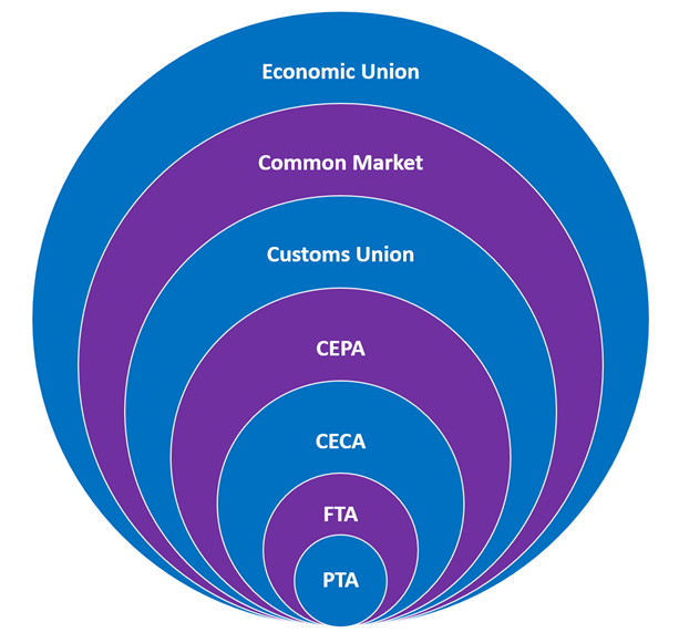 As countries move from PTA → FTA → CECA/CEPA → Customs Union → Common Market → Economic Union, the degree of economic cooperation continuously deepens.
