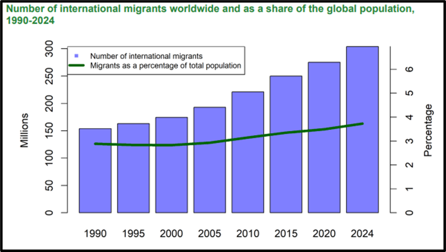 - In 2024, 304 million international migrants were recorded, nearly double the 1990 figure (154 million).