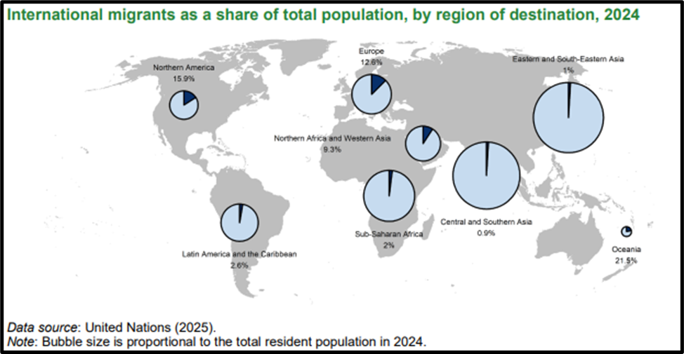 - Oceania: Though small in population (46 million), it had the highest migrant share at 21% of its population.