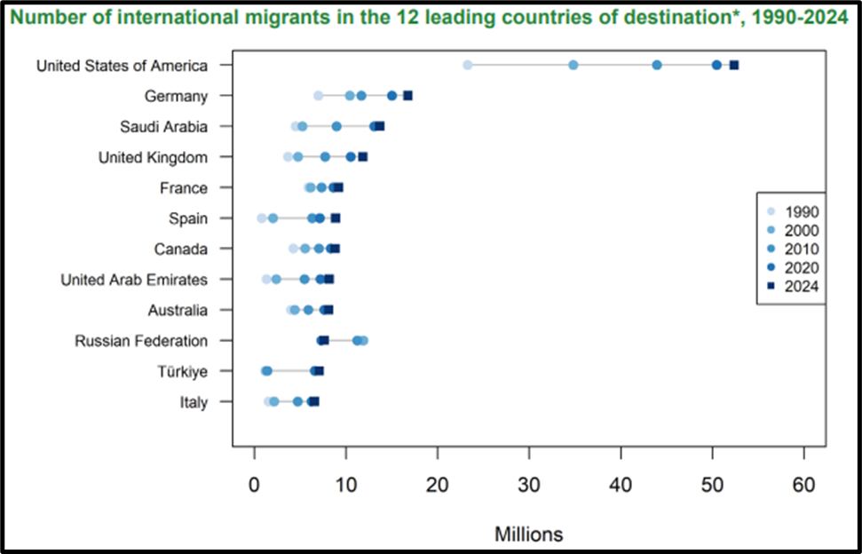 - USA (52.4 million) hosted the most migrants.