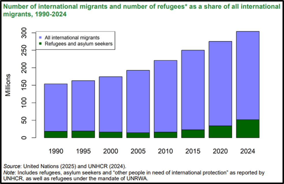 - 18 million forcibly displaced persons added between 2010–2024, accounting for 20% of the global migrant increase.