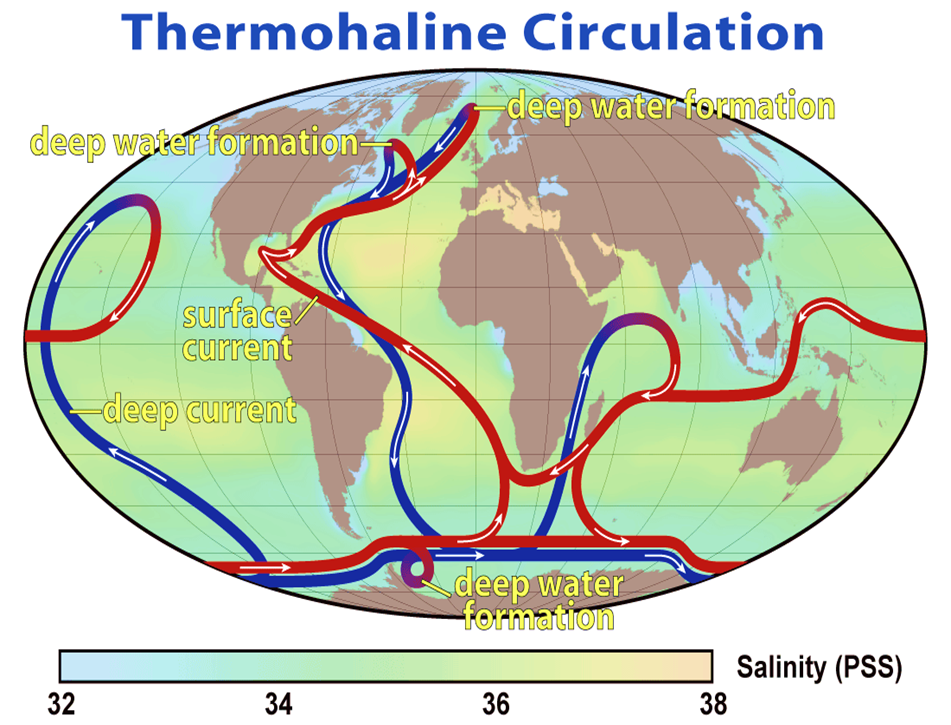 Now, let’s dive deeper. What happens to the water that sinks? It doesn’t just sit still—it moves. This movement forms the deep ocean currents, also known as thermohaline circulation (from thermo = heat, haline = salt).