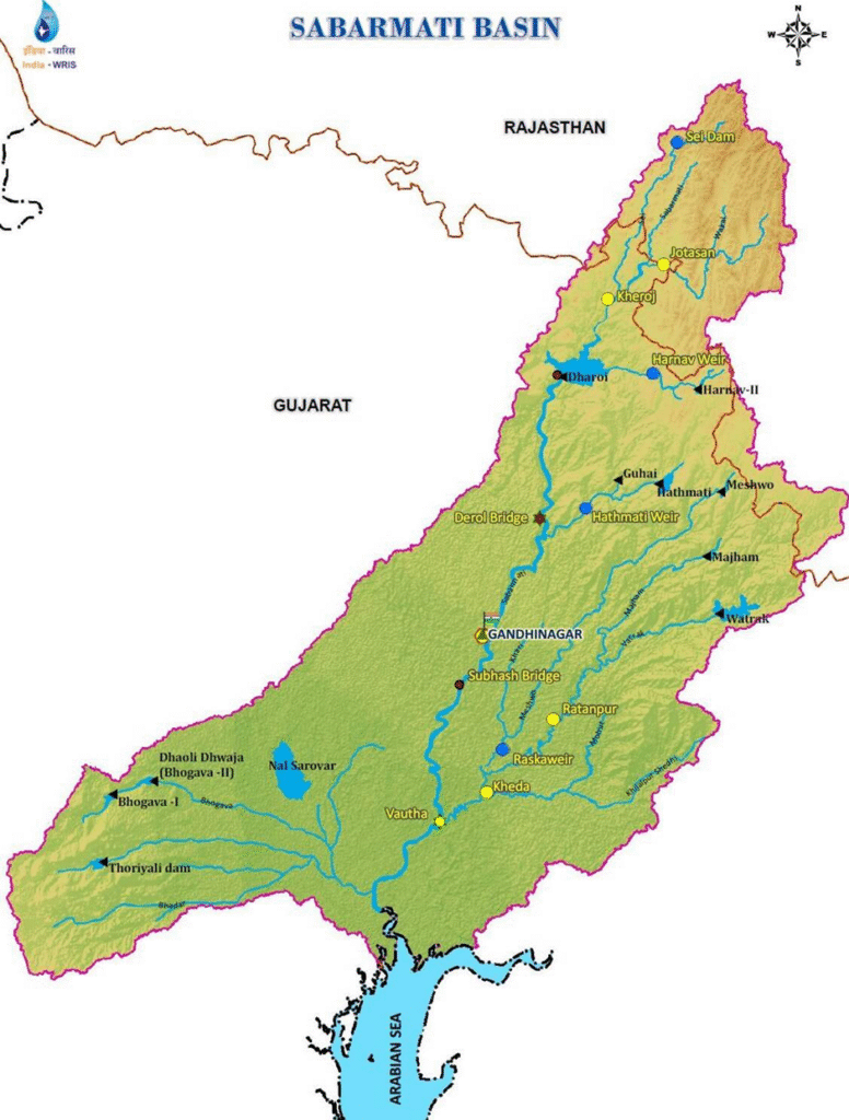 - Outfall: Doesn’t meet the sea like most rivers — instead, it “disappears” into the marshes of the Rann of Kachchh.